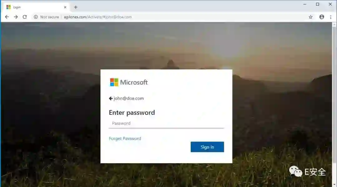 收件人点击“再次发送”链接后,将会进入一个伪装为Office365合法登录页面的钓鱼网站。该链接以“ #[emailaddress]”结尾,如“#@john@doe.com”,这将导致电子邮件地址在页面中自动填充,正如下图所示。