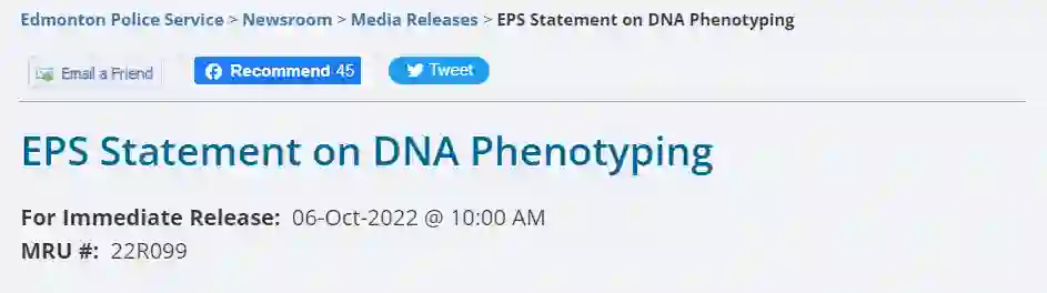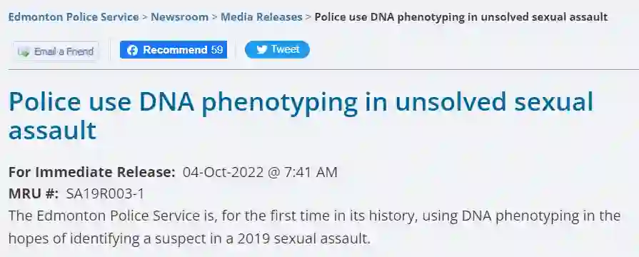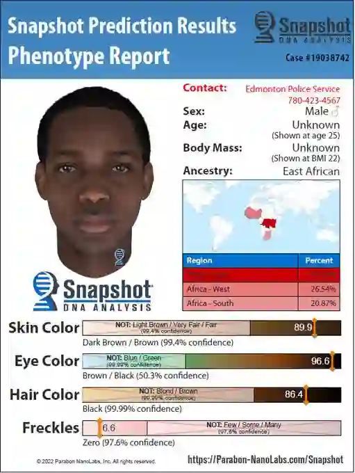最近位于加拿大的埃德蒙顿警察局(EPS)公布了一张2019年性侵案嫌疑人的合成照片,由Parabon NanoLabs公司使用DNA表型(phenotyping)分析技术对掌握的DNA证据进行面部合成。