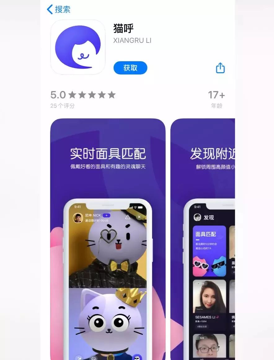也就是说,猫呼更像是一款拥有美颜美妆特效功能、可通过面具功能对真人长相进行特效化展示、实时匹配交友的在线视频软件。