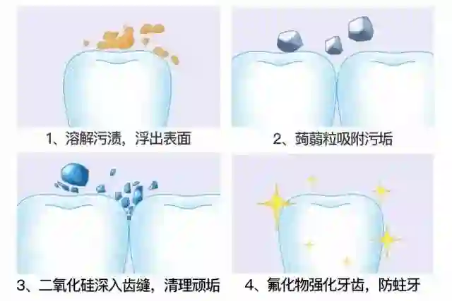 加上牙膏中二氧化硅和氟化物的成分,能进一步清洁和保护牙齿。