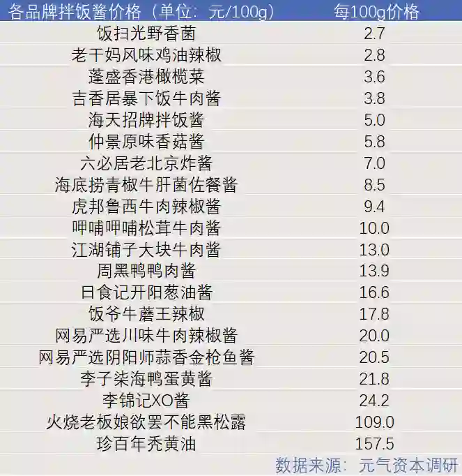 。根据元气资本调研数据,拌饭酱市场价格差异非常大,从每100克单价2.7元的菌菇酱至最高150元/100g的秃黄油都有分布。而较早进入拌饭酱市场的品牌产品定价多集中在每100克6元以下,更高价的市场仍然有很大的空间,这也是跨界进入这一领域的非调味料品牌瞄准的价格区间。