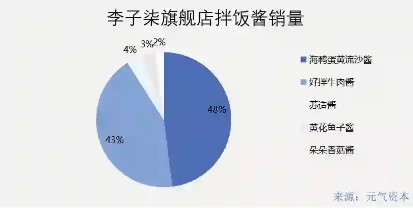 李子柒拌饭酱中最受欢迎的是海鸭蛋黄流沙酱和好拌牛肉酱,其中海鸭蛋黄流沙酱口感独特,与传统肉酱形成差异化错位竞争,为全网同类产品销量最高。