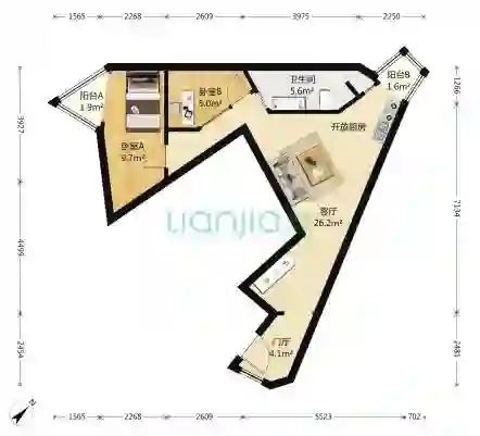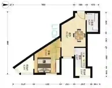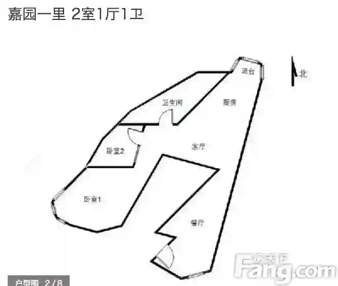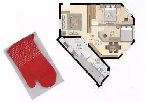 还有高跟鞋户型,一室一厅一厨一卫,房间布局倒还算紧凑合理,没有太多不便,不过卧室的北面墙也真是够斜(邪)乎了。