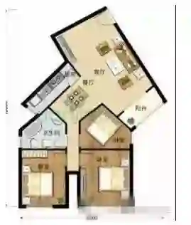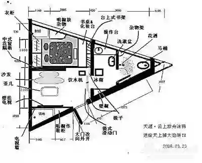 这个户型出自网友“天上掉大馅饼”在天涯发的帖子《应该是天涯上最差的小户型了,求助……》。一个横卧的等腰三角形,拦腰被隔成一个小三角和一个梯形,梯形就是卧室,小三角兼顾厨房和卫生间的功能,还有一整面墙是玻璃。“三明治”户型,真是名符其实啊!