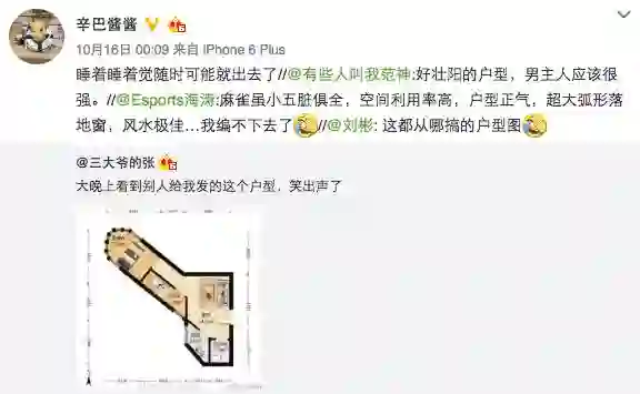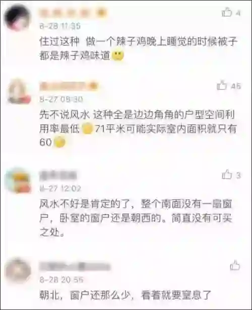 有网友评论,“这种户型真是天才的设计———三角形最稳固,至少地震结实一点”,“楼主这房子有个好处,算面积特方便,三角形面积=底*高/2,哈哈哈哈”。
