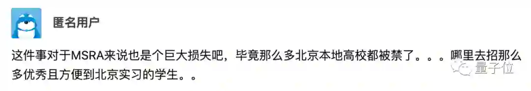 直白说,北京理工大学,北京航空航天大学,南京理工大学,南京航空航天大学,哈尔滨工业大学,哈尔滨工程大学、西北工业大学,以及北京邮电大学的学生,之后将难以进入MSRA实习,至于校招和就业是否也会受影响,尚未可知。