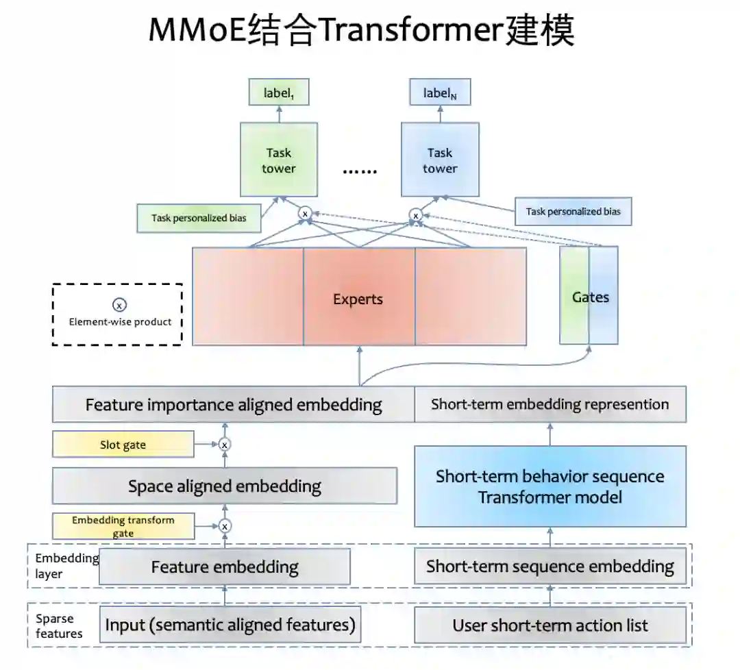 通过以上 3 点的改动,模型将输入层的 embedding 表示从特征语义,embedding 在不同业务分布,特征在不同业务重要性三个层面做了归一化和正则化,重新映射到统一的特征表征空间,使得 MMoE 网络在此空间上更好的捕捉多个任务之间后验概率分布关系。通过此项对 MMoE 的改进,模型所有的目标提升非常显著。