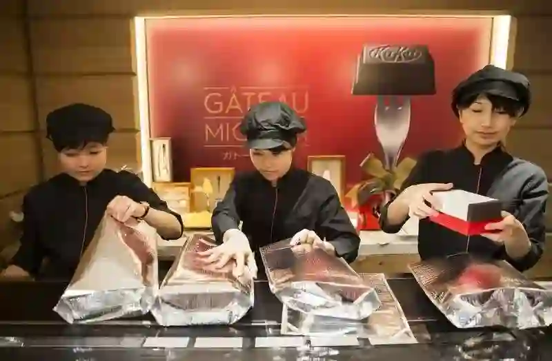 对于喜爱这种小零食的人来说,一个热门的去处就是与东京站相连的地下购物中心的Kit Kat巧克力店,雀巢公司在这里销售高端的Kit Kat,单价超过1500日元(约合14美元)。盒装的季节限定口味(覆盆子或是西柚味)裹着金灿灿的包装纸,堆放在柜台上,有些售价高达3500日元(约合32美元),比普通的袋装Kit Kat贵出10倍以上。7月25日,装修后的雀巢日本巧克力旗舰店在东京的中心商业区银座重新开张。