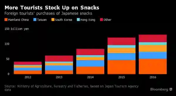 依靠旅游业的繁荣,这是一场必赢的赌局。日本国家旅游局称,2017年的前六个月,游客在日本的花销飙升至创纪录的2.5万亿日元(约合225亿美元)。游客在糖果糕点上的花费也越来越多,根据日本环境省的数据,糖果消费量在过去的四年内增长了至少两倍,在2016年达到了1310亿日元(约合12亿美元)。