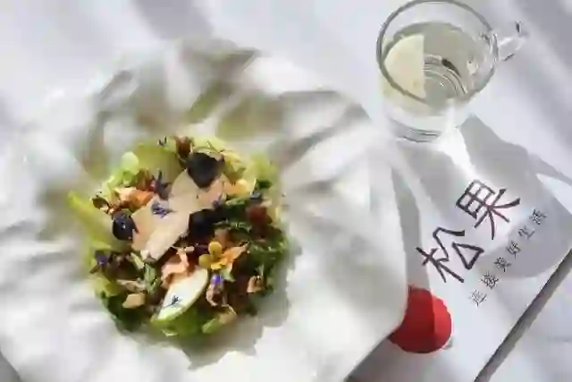 ② 以生菜、芝麻菜、樱桃萝卜作为底菜,放入准备好的鸭胸肉、黑松露和山核桃,点缀青苹果片。