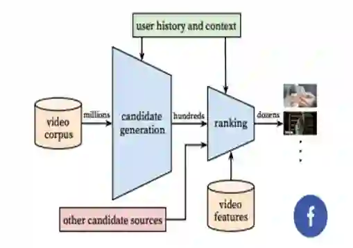 下面这张图是 YouTube 推荐系统的体系结构,在向用户展示少量推荐视频之前,会对视频进行检索和排名。
