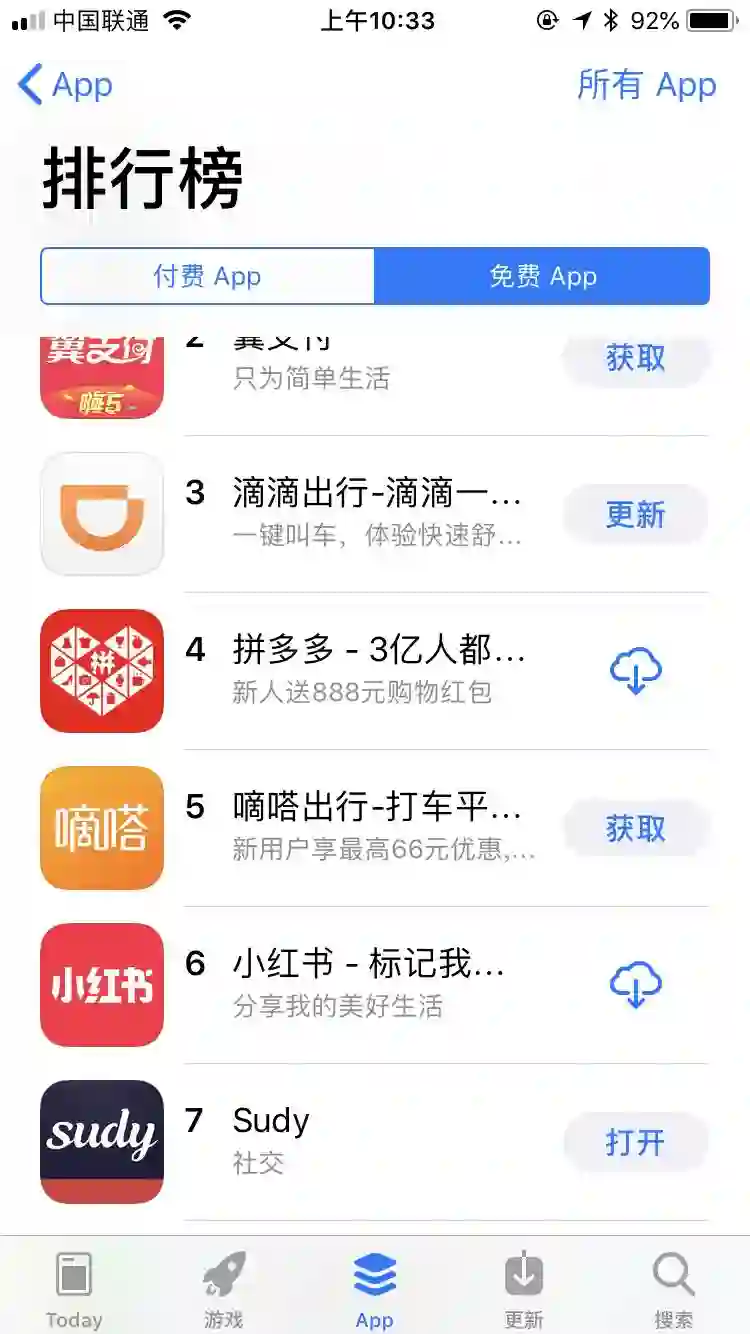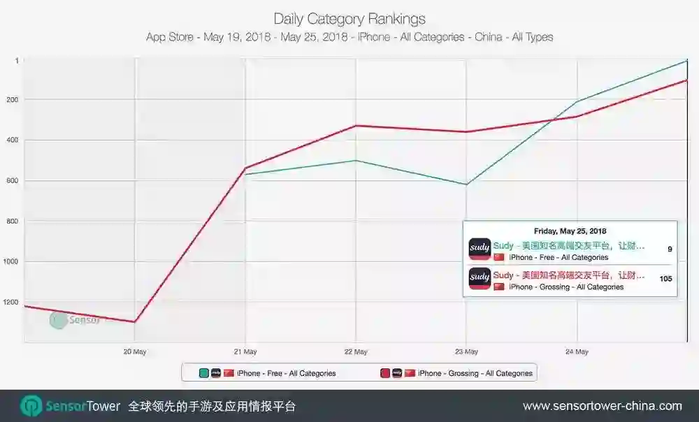最近,中国区 App Store 免费榜上,出现了一个新面孔。根据 Sensor Tower 提供的数据,一款名为 Sudy 的社交类 App 增长迅速,过去几年其在中国 App Store 的免费榜和畅销榜上基本都排名 1500 以外。但从今年 5 月 19 日开始,下载量和收入飙升,目前排在免费榜第七名,超过了微信、今日头条、淘宝等大应用。
