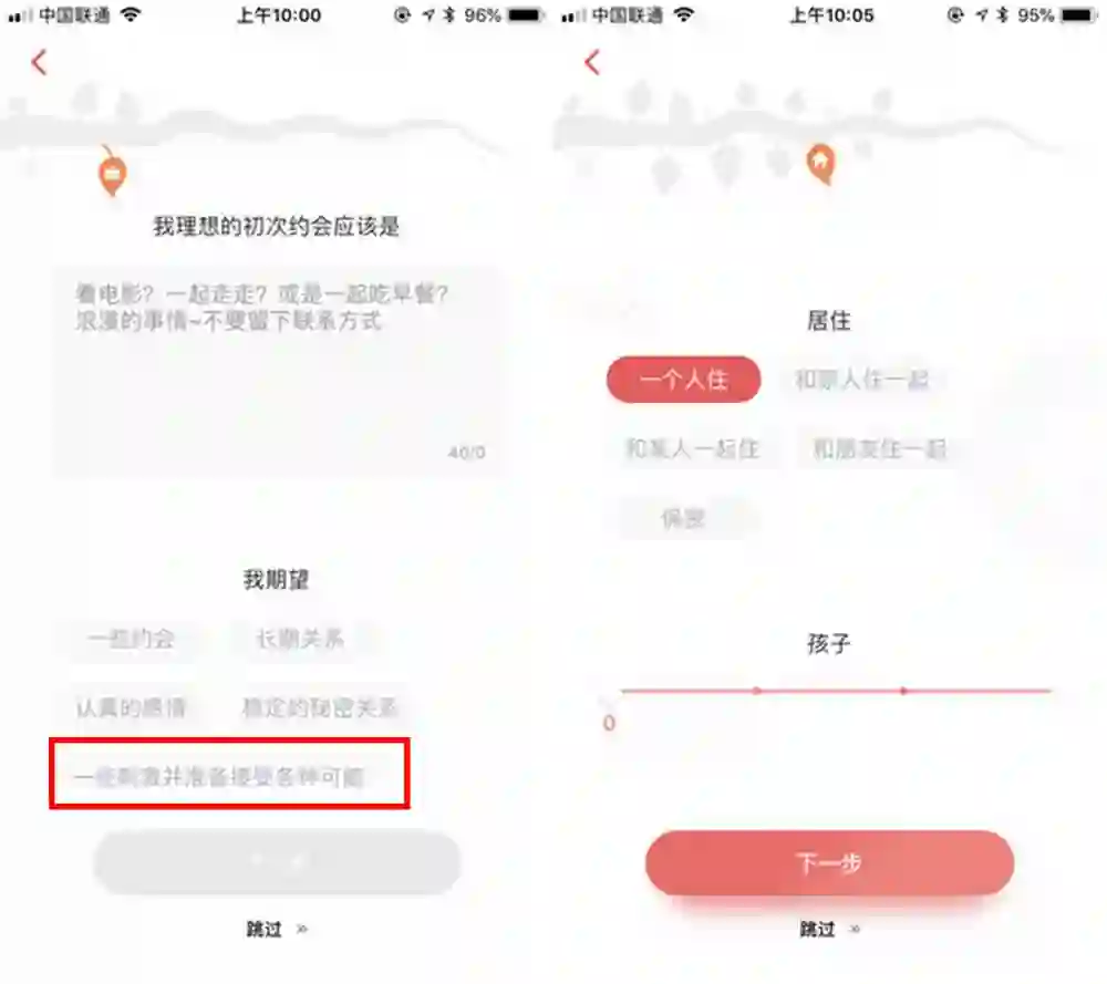 在注册过程中,某些选项也有着强烈的暗示意味,“一些激并准备接受各种可能”这基本上等于签了卖身契;是否一个人住的选项,也像是要把“枕边缺人”贴在脑门上。