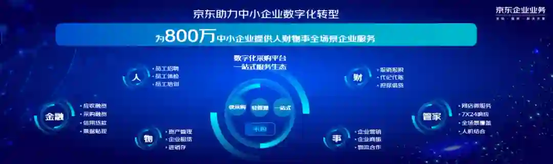 截至目前,京东企业业务的大中小融通服务正在融入到产业各方的中小企业服务工作中。