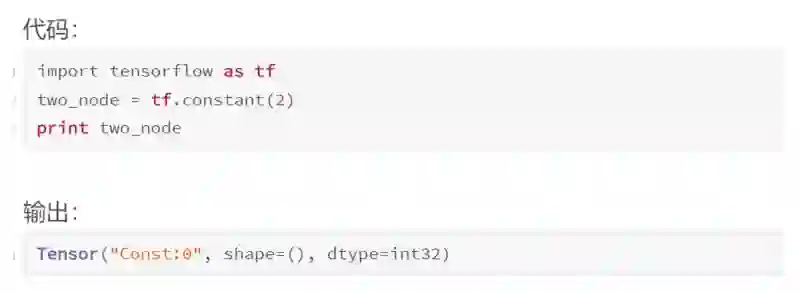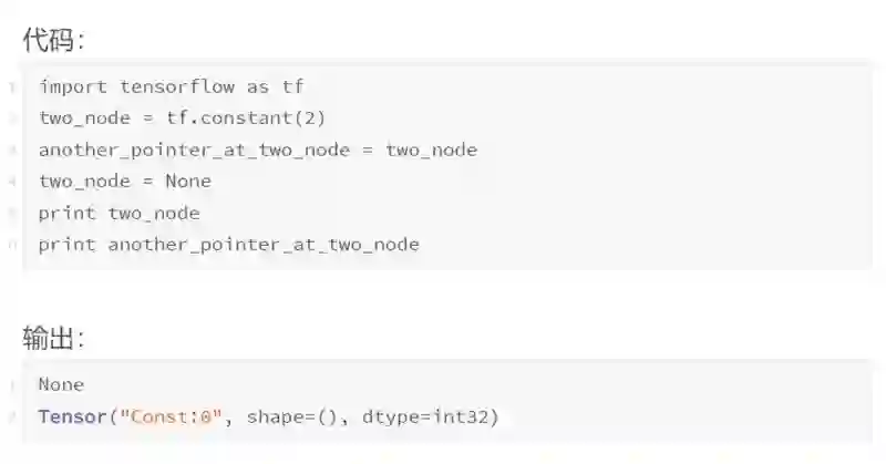 快看!我们得到了一个节点,它包含常量:2。我知道你很惊讶,惊讶的是一个名为 tf.constant 的函数。当我们打印这个变量时,我们看到它返回一个 tf.Tensor 对象,它是一个指向我们刚创建的节点的指针。为了强调这一点,这里是另一个例子: