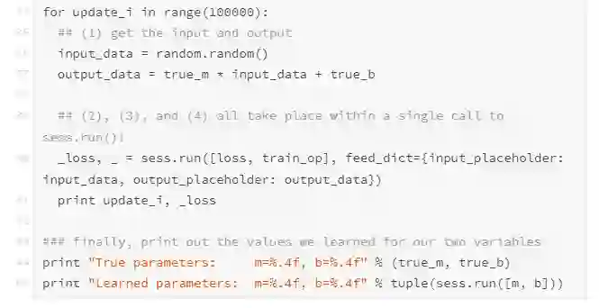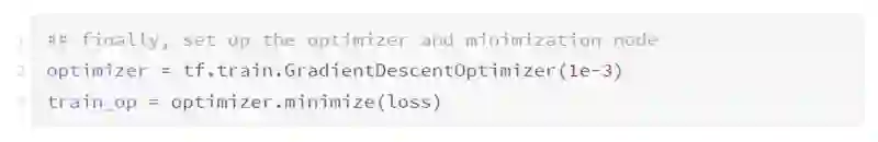 既然你对 Tensorflow 的基本概念已经有了很好的理解,这段代码应该很容易解释!第一行,optimizer = tf.train.GradientDescentOptimizer(1e-3) 不会向图中添加节点。它只是创建了一个 Python 对象,包含了一些有用的函数。第二行 train_op = optimizer.minimize(loss),将一个节点添加到图中,并将一个指针赋给 train_op。train_op 节点没有输出,但有一个非常复杂的副作用: