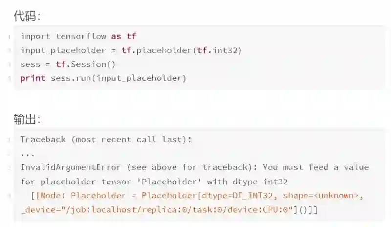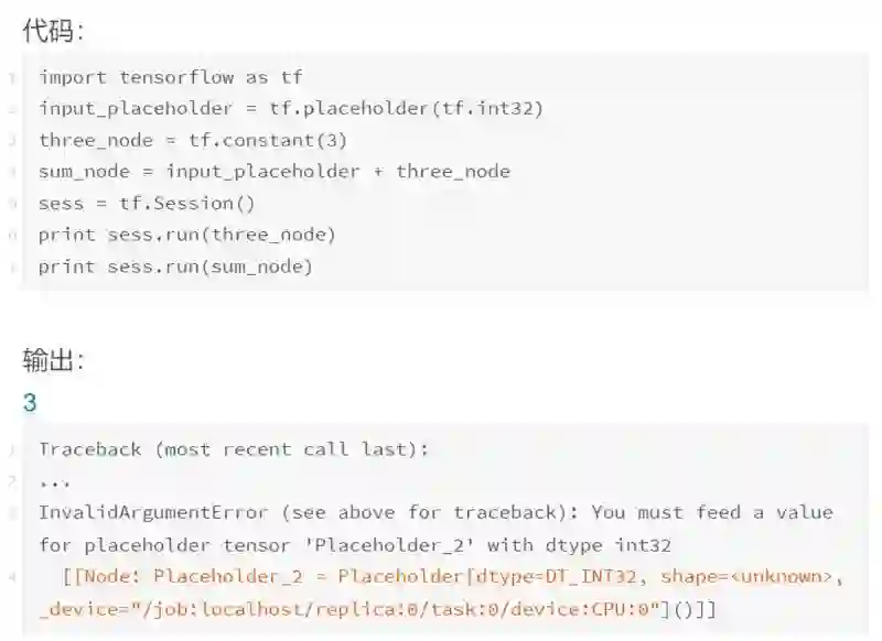 ……这是个糟糕的例子,因为它引发了一个异常。占位符预计会被赋予一个值,但我们没有提供,因此 Tensorflow 崩溃了。