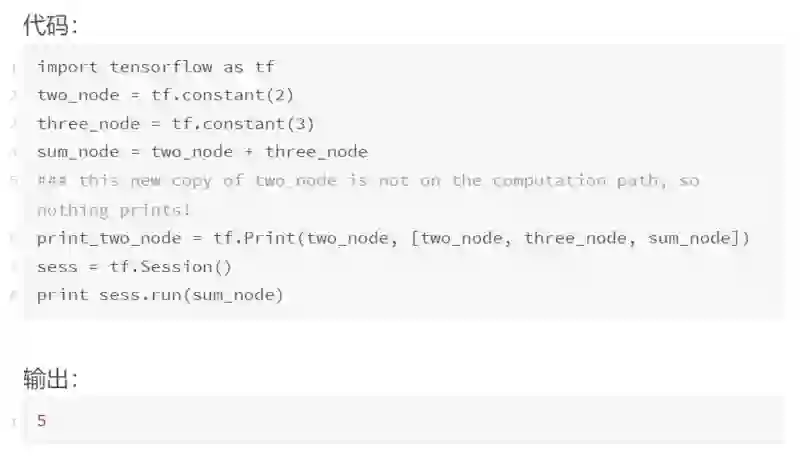 有关 tf.Print 的一个重要却有些微妙的点:打印其实只是它的一个副作用。与所有其他副作用一样,只有在计算流经 tf.Print 节点时才会进行打印。如果 tf.Print 节点不在计算路径中,则不会打印任何内容。即使 tf.Print 节点正在复制的原始节点位于计算路径上,但 tf.Print 节点本身可能不是。这个问题要注意!当这种情况发生时,它会让你感到非常沮丧,你需要费力地找出问题所在。一般来说,最好在创建要复制的节点后立即创建 tf.Print 节点。