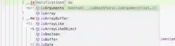 在其他地方,自动补全功能可从一个 React 组件的 Prop Type 中识别出参数,并自动建议。进一步的自动补全功能需要通过按下 ctrl-space 手动触发。一个例子是搜索 lodash 函数,搜索“is”返回 lodash 包,而不是个别单独的函数。这是 VS Code 中的一个自动功能。