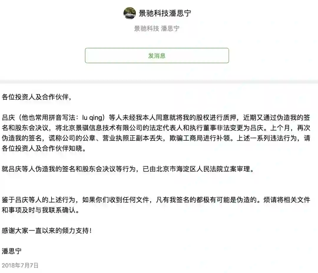 7月7日下午,景驰科技法人代表潘思宁在个人公众号上发布一则重磅公告:景驰科技CFO吕庆等人未经潘本人同意,将潘思宁的股权进行质押,近期又通过伪造潘思宁的签名和股东会决议,将北京景骐信息技术有限公司的法定代表人和执行董事非法变更为吕庆。上个月,再次伪造潘思宁的签名,谎称公司的公章、营业执照正副本丢失,欺骗工商局进行补领。潘思宁还在文中写到,该事件已由北京市海淀区人民法院立案审理。