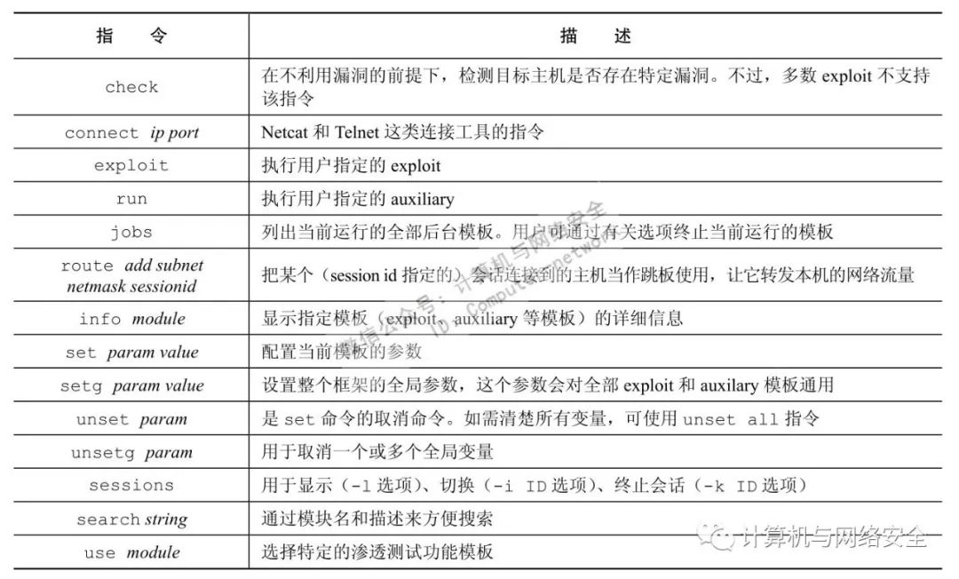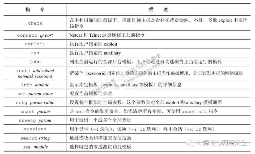 我们将最具价值的几个常用命令总结为下述表格。您可以在 Metasploit 的控制台(console)中进行上机练习。指令中的斜体字部分,是您来指定的参数。