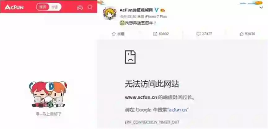 2月2日上午,中国二次元弹幕视频网站AcFun官微发布微博:“我想再活五百年! ”并配了流泪的表情符号,其网站已经无法打开,而A站App也显示“加载失败”。有媒体评论说,A站凉了。早在2月1日,Acfun就被曝融资不畅,员工计划抱团讨薪。但当时A站网站仍能正常访问,且在1日凌晨零点12分,A站官微发布一个“喵喵”表情,似是对传言做出回应。