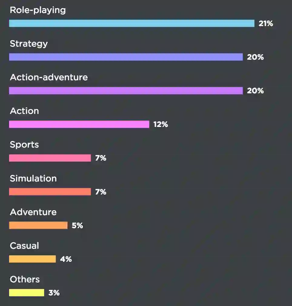 而在游戏类型方面,全职开发人员更喜欢玩模拟和策略类游戏,兼职开发者和自由职业者偏爱动作(冒险)和角色扮演类游戏,学生则独爱动作冒险类。