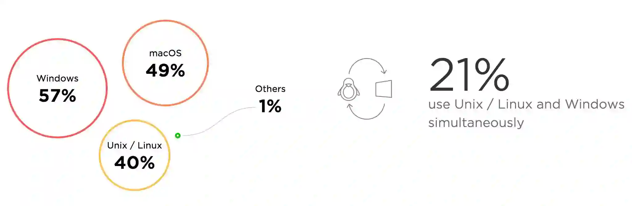 Windows 占比最高,macOS 也有接近一半的占比,还有 21% 的同时使用 Unix / Linux 和 Windows 。