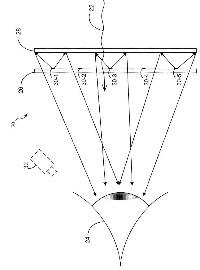工作时光源向全息基板发光,全息基板由光学元件组成,可将数字图像编码到全息基板的表面。眼动追踪器32提供信息,使得显示设备根据眼睛位置渲染图像,让图像通过电子和光学的方式设置到用户的瞳孔位置。