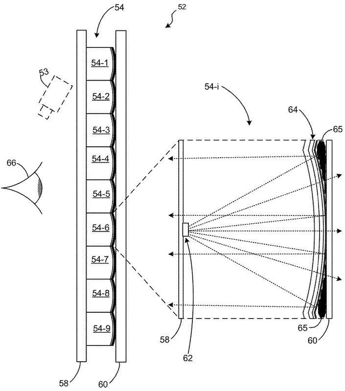 第三种虽然使用的还是小透镜,却是反射的方案。主要组成是渲染元件54,右侧为原件的放大图。