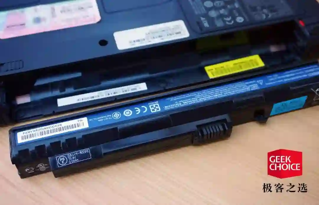 在了解过 D 面结构之后就会明白,在前文中提到的转轴设计,其实是不得已而为之。为了保证 10.1 英寸的整机尺寸容下主板、硬盘、散热风扇、热管等,如果不想增加厚度,那么电池就必须要放在一个「不碍事」的地方——转轴,这个容量只有 23.76Wh 的长条形 3 芯电池就和转轴很好的融合在了一起,这也算是宏碁 Asipire One 在设计上的巧思吧。