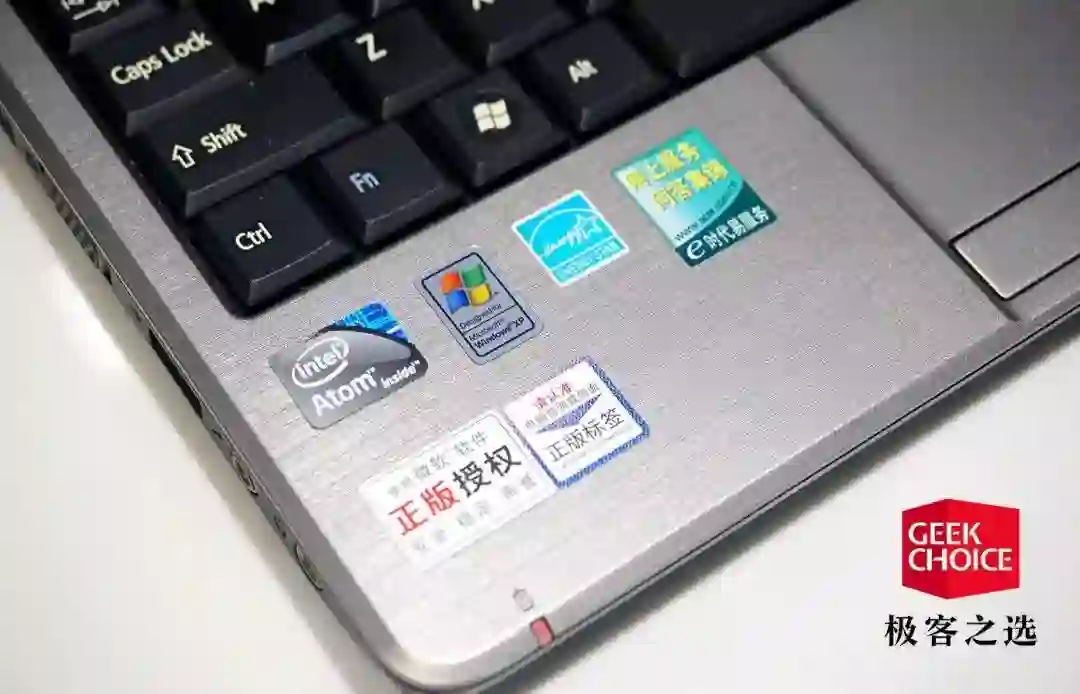 除了 C 面的布局和尺寸以外,掌托处的贴纸也很有意思,比如像正版 Windows 的贴纸、英特尔 Atom 处理器的贴纸、能源之星的贴纸等等,右侧还有上网本的一些关键特性。虽然现在的笔记本依然保留了这个传统,但是大多数只有 CPU 和显卡两个贴纸,可以说这些贴纸「矩阵」同样散发着浓浓的怀旧气息。