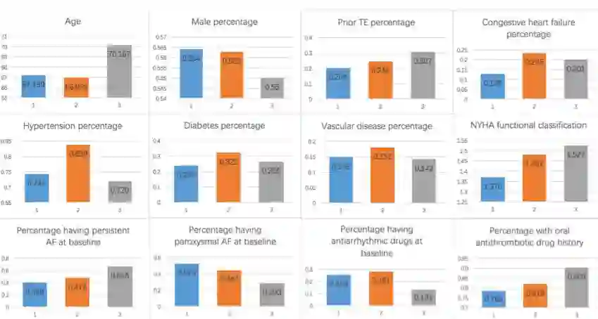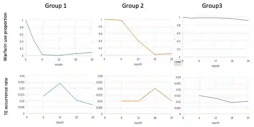 结果显示出华法林用药在人群中呈现出三条不同轨迹。按轨迹将人群分为 3 组后,可观测出与脑卒中的发生有着密切关系。