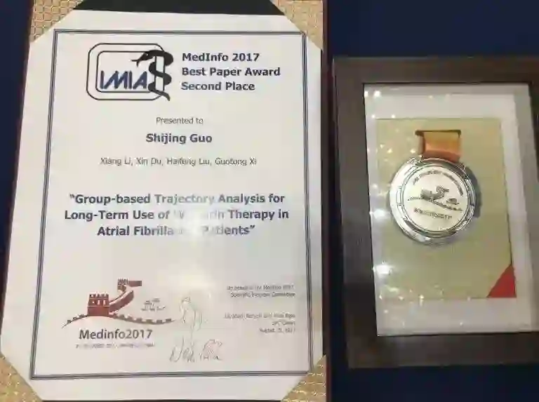 其中,《针对房颤患者长期华法林用药的基于群的轨迹分析》(郭世婧,李响,杜昕,刘海峰,谢国彤)获得了大会最佳论文第二名。