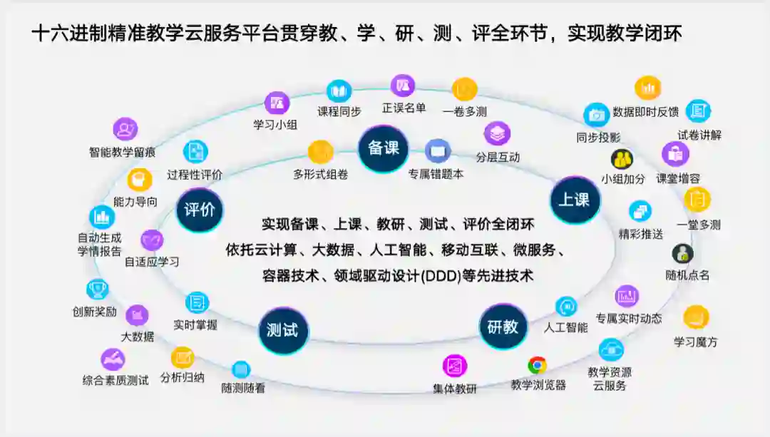 十六进制以课堂教学为中心覆盖完整教学流程,在各个精细环节对接和融合第三方应用,进行大数据整合并提供增值服务,最终成为