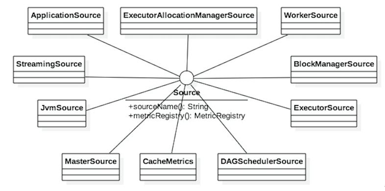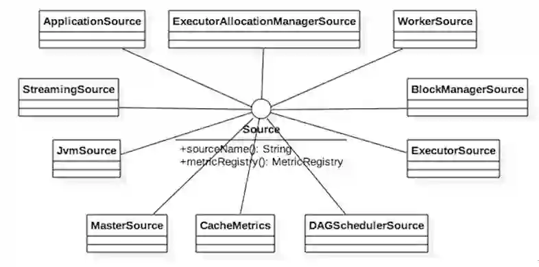 Source:指定了从哪里收集度量数据,即度量数据的来源。Spark提供了应用的度量来源(ApplicationSource)、Worker的度量来源(WorkerSource)、DAGScheduler的度量来源(DAGSchedulerSource)、BlockManager的度量来源(BlockManagerSource)等诸多实现,对各个服务或组件进行监控。