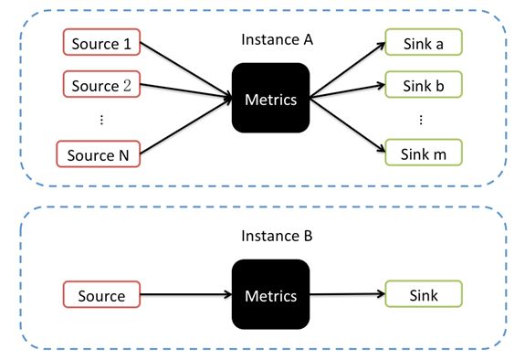 为了更加直观地表现上述概念,我们以图1来表示Spark中度量系统的工作流程。