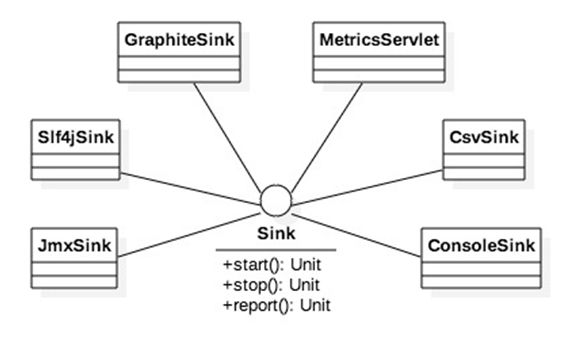 Sink:指定了往哪里输出度量数据,即度量数据的输出。Spark中使用MetricsServlet作为默认的Sink,此外还提供了ConsoleSink、CsvSink、JmxSink、MetricsServlet、GraphiteSink等实现。