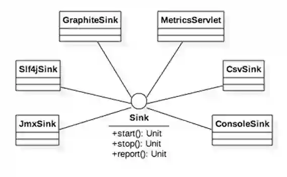 Source准备好度量数据后,我们就需要考虑如何输出和使用的问题。这里介绍一些常见的度量输出方式:阿里数据部门采用的一种度量使用方式就是输出到日志;在命令行运行过Hadoop任务(例如:mapreduce)的使用者也会发现控制台打印的内容中也包含度量信息;用户可能希望将有些度量信息保存到文件(例如CSV),以便将来能够查看;如果觉得使用CSV或者控制台等方式不够直观,还可以将采集到的度量数据输出到专用的监控系统界面。这些最终对度量数据的使用,或者说是输出方式,Spark将它们统一抽象为Sink。Sink的定义见代码清单3。