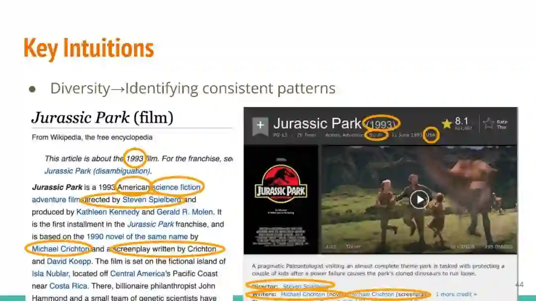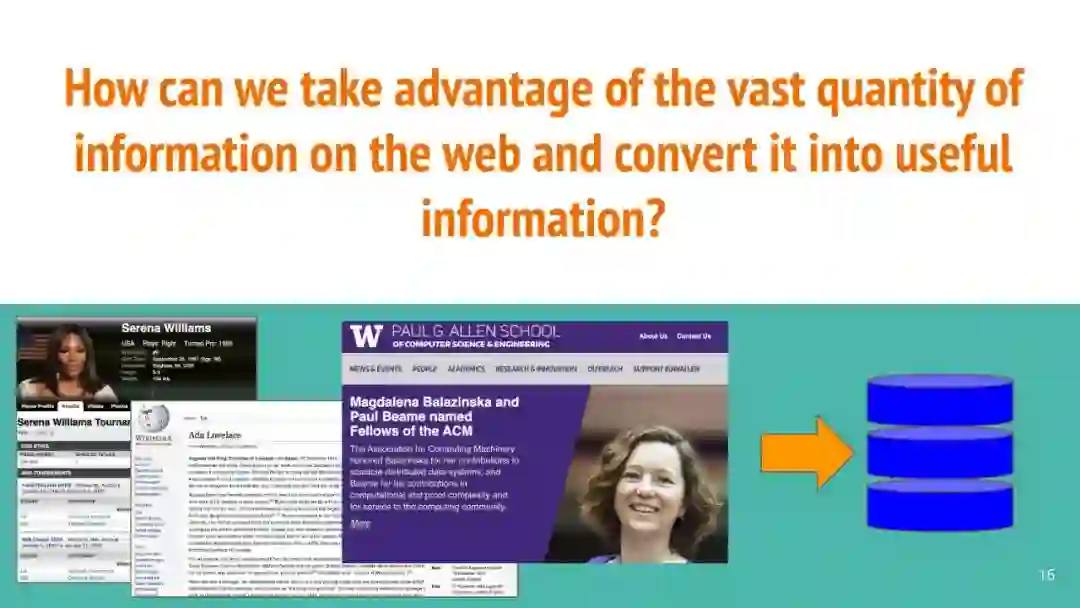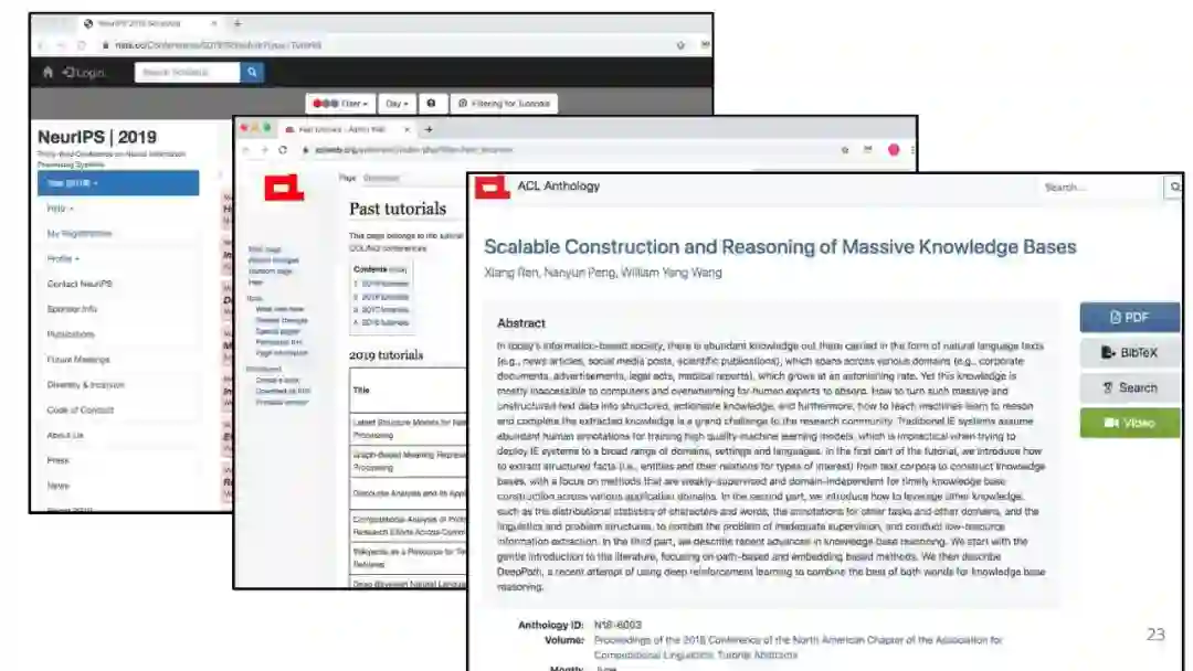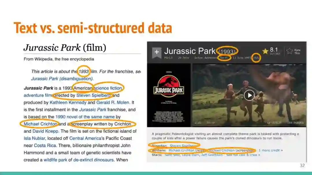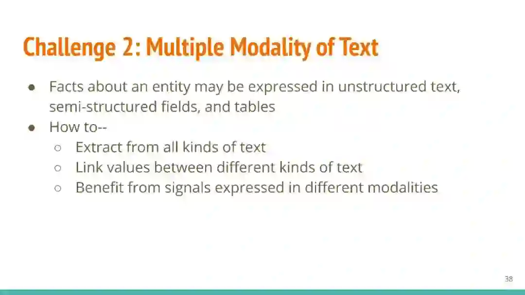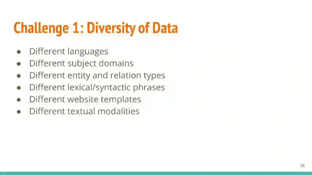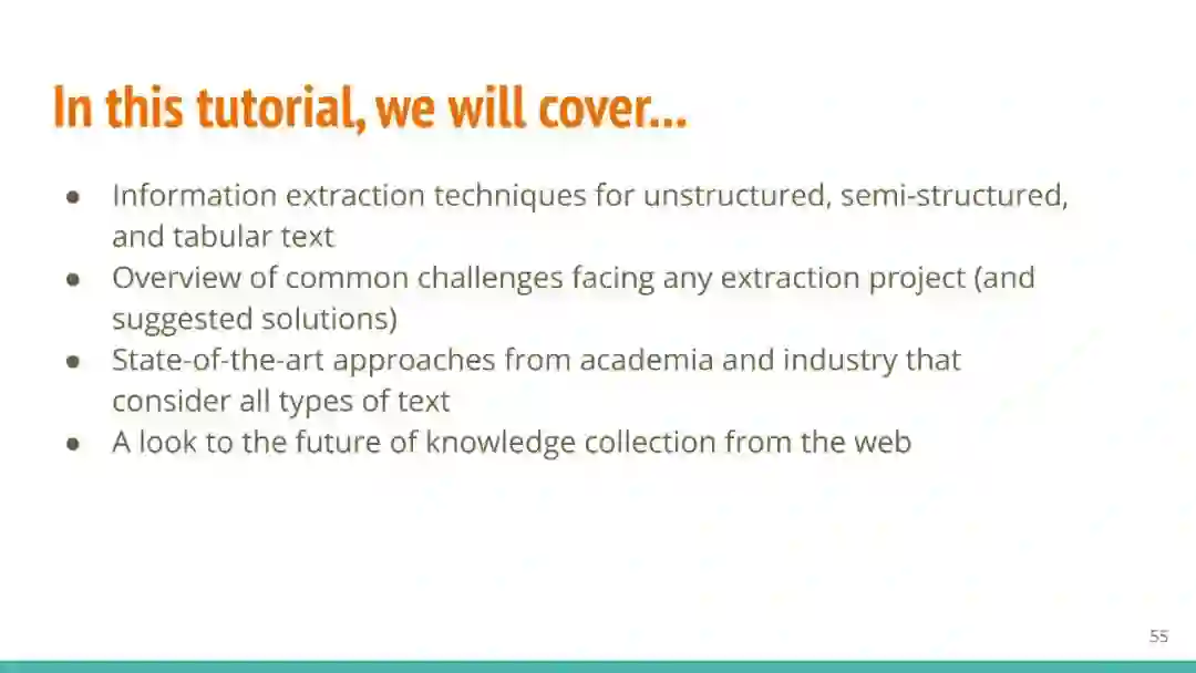 万维网以多种形式包含大量的文本信息:非结构化文本、基于模板的半结构化网页(以键-值对和列表的形式呈现数据)和表格。从这些资源中提取信息并将其转换为结构化形式的方法一直是自然语言处理(NLP)、数据挖掘和数据库社区研究的目标。虽然这些研究人员已经很大程度上根据数据的模态将web数据的提取分离到不同的问题中,但他们也面临着类似的问题,比如使用有限的标记数据进行学习,定义(或避免定义)本体,利用先验知识,以及针对web规模的可扩展解决方案。在本教程中,我们将从整体的角度来看待信息抽取,探索挑战中的共性,以及为解决这些不同形式的文本而开发的解决方案。