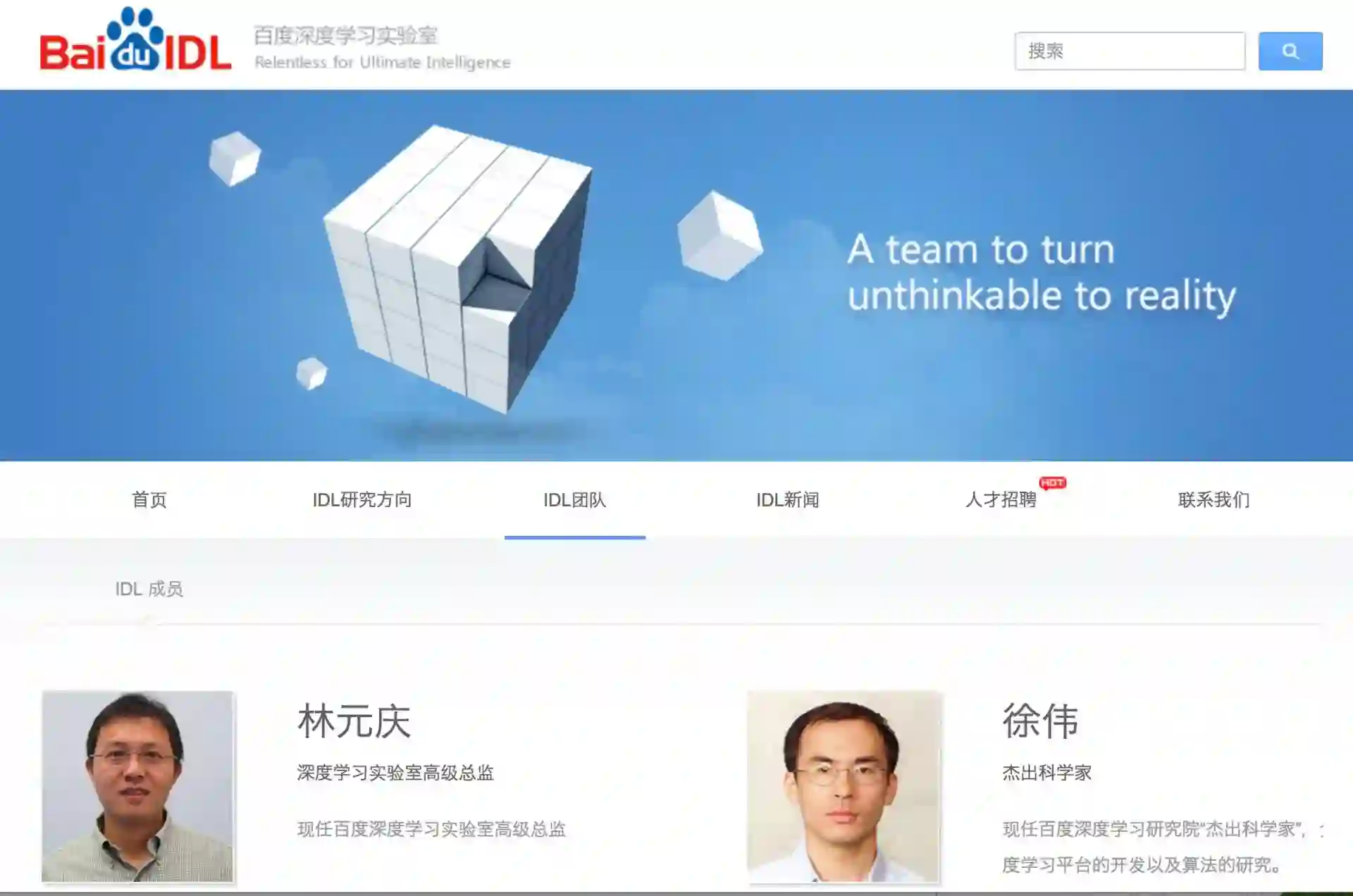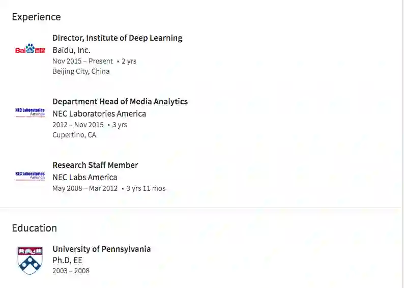 百度历任职位:深度学习实验室(IDL)主任,百度研究院院长(2017年3月)