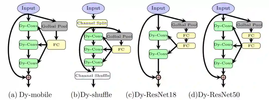 作者给出了mobileNet、shuffleNet、resnet18、resnet50上的增加动态卷积的方式: