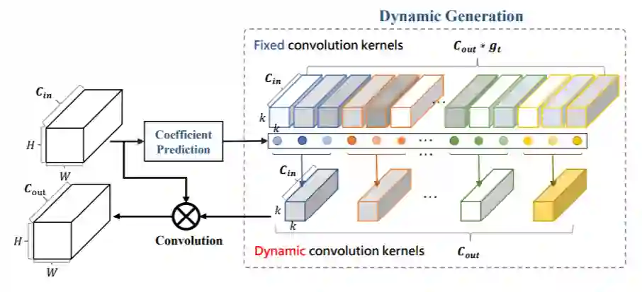 其核心思想和谷歌提出的条件卷积类似,通过activation生成一组权重,然后对fixed 权重进行加权求和生成动态卷积的权重。和CondConv主要区别在于该论文生成的权重参数更多,对于谷歌而言,一组卷积核的权重是共享的,而该论文是不共享的。