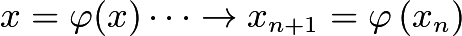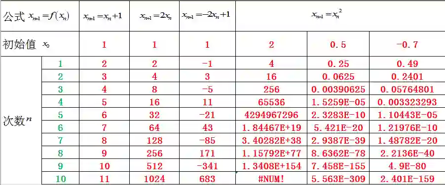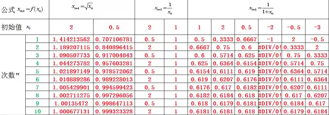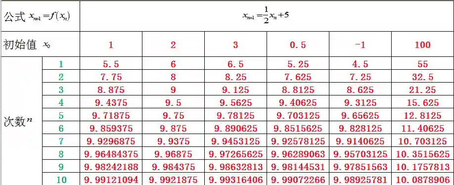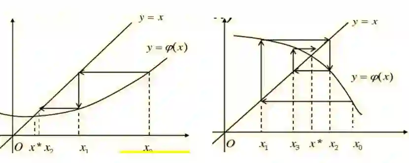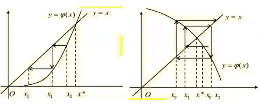 但是当迭代包含平方,根式,分式等关系时,我们仍发现结果存在发散和收敛的情况。当我们观察的函数不局限等比等差这种规范的关系时,给出任意非线性函数,以及不同的初始值,发现在某些情况下,不断迭代的结果会趋向于一个定值,而这个值我们在数值分析中称为不动点,不动点迭代(Fixed point iteration)指的是:选择适当的初始值 ,按照如下的迭代格式计算,