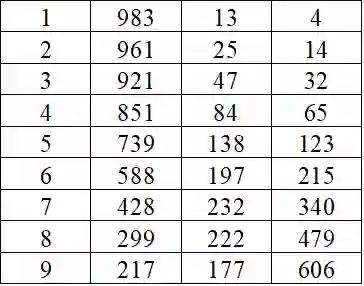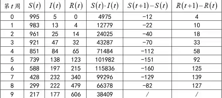 假设现有一种初发的流行疾病,如果我们能够基于目前掌握的情况对它未来的传播规律有一定的了解,那么显然有助于疫情的控制。下面我们将建立一个数学模型去解决这个问题:首先将人群分为三类,分别是“易感染但未感染者”(用函数S(t)来表示,单位:人;t ≥0 代表时间,单位:周,下同)、“已感染,但未痊愈或死亡者”(用函数I(t)表示)、“已痊愈或已死亡者” (用函数R(t)表示)。假设这种疾病一旦已感染过一次之后不会再度感染。下表4中为以一千人为样本容量前10周的疫情跟踪统计情况。简便起见这里不考虑病毒的变异。