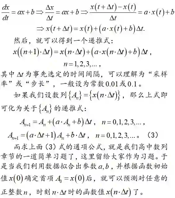 备注2:方法3只是一种估计的方法,结果不是 x(t) 的真实值,但是考虑到 x(t) 本身也就是对自然界现象的估计,所以是否是真实值问题并不大,关键在于近似的精度是否足够高。可以证明,当所求函数 x(t) 的导数有界时,这种方法可以任意经典逼近所求函数 x(t) 的真实值——步长△t>0 越小,则精度越高。但 △t 是越小,计算的复杂度就越高。例如:当步长为 0.0001 时,要预测 x(1),如果利用递推式逐项计算,就需要计算100000步,虽然精度高,但是计算代价也大;而步长为 0.1 时,要预测 x(1),同样的方法只需计算 10 步即可,但是这样一来精度就会下降。所以如何寻求计算代价和精度之间的平衡,有时需要反复尝试,这是一种权衡的艺术。