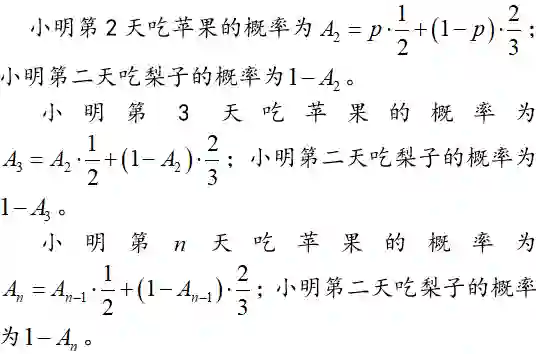 假设小明第一天吃苹果的概率为 p,吃梨子的概率为 1-p。利用高中所学的概率中的加法原理和乘法原理,我们很容易计算: