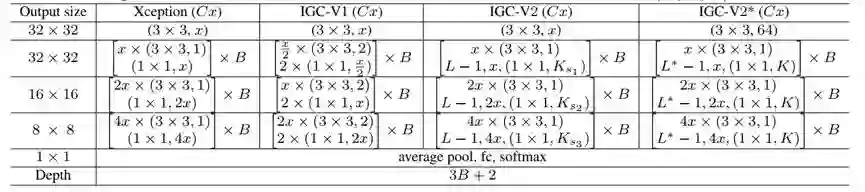 变化网络的宽度:我们采用 20 层网络,表 1 显示了网络的结构,即 Xception()、IGC-V1(