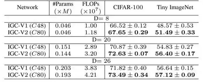 表 4:IGC-V1 和我们的网络 IGC-V2 在变化深度时的分类准确率的对比。