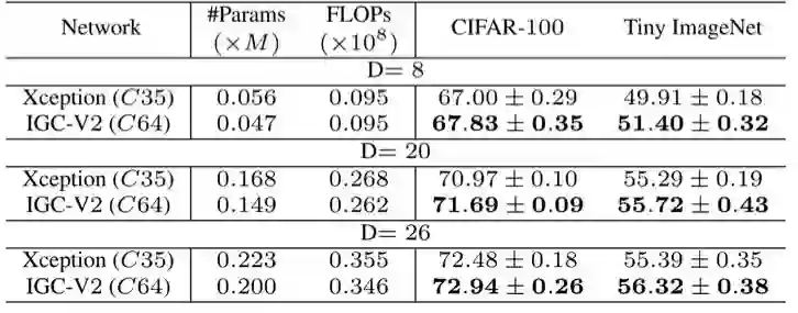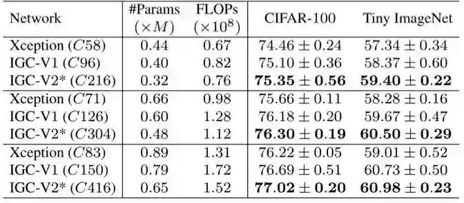 通过大量实验表明,IGC-V2 比 IGC-V1 和 Xception 在 CIFAR 和 Tiny ImageNet 上的性能更优。